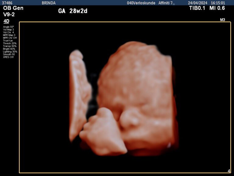 A 3D/4D ultrasound can be done throughout the pregnancy. It is important to know that between 15 and 24 weeks your baby is still thin, which is also visible on the ultrasound. The best time to have a 3D/4D ultrasound done is between 25 and 32 weeks. Your baby will have a fuller face by then, so you can sometimes already see who the baby resembles. You decide at which term you would like to admire your baby, sometimes even at 39 weeks we still have beautiful images.